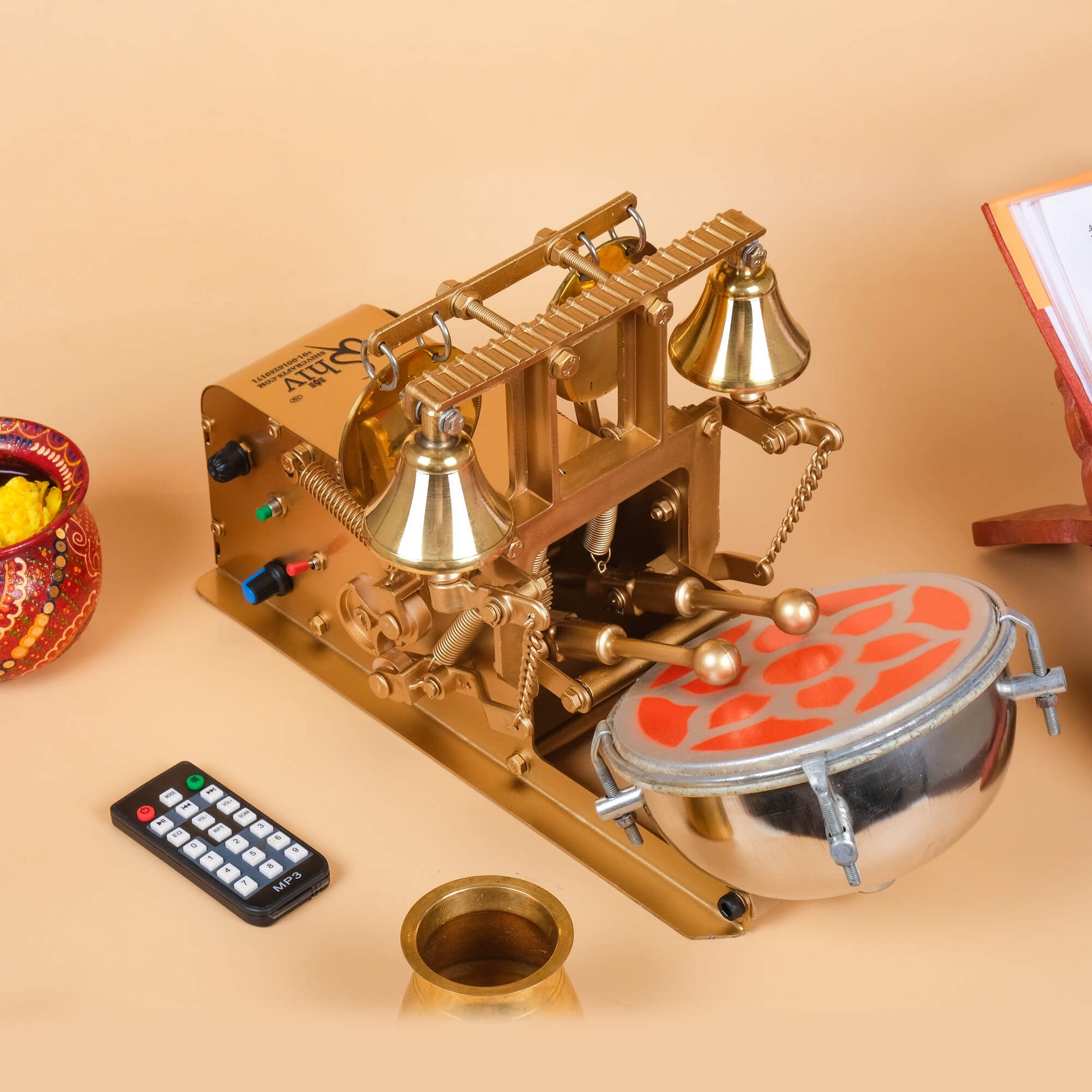 It has a built-in motorized system that automates temple bells, Shankh (conch), and Nagada (drum) sounds. Just plug it in and start the Aarti with a single switch.
