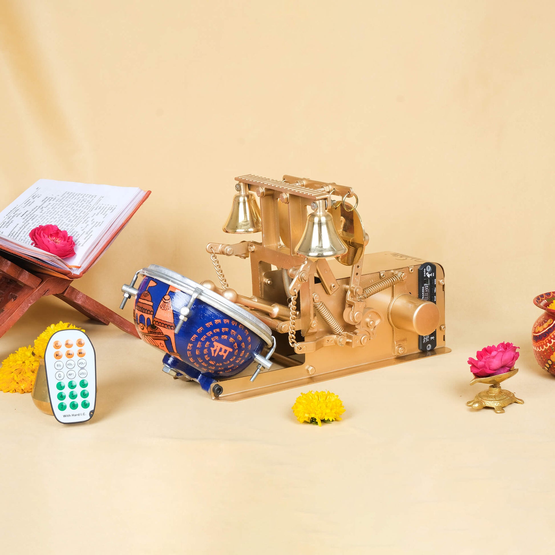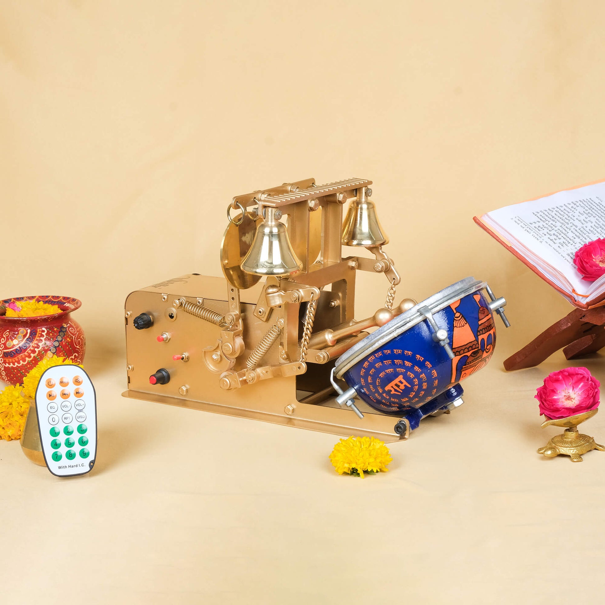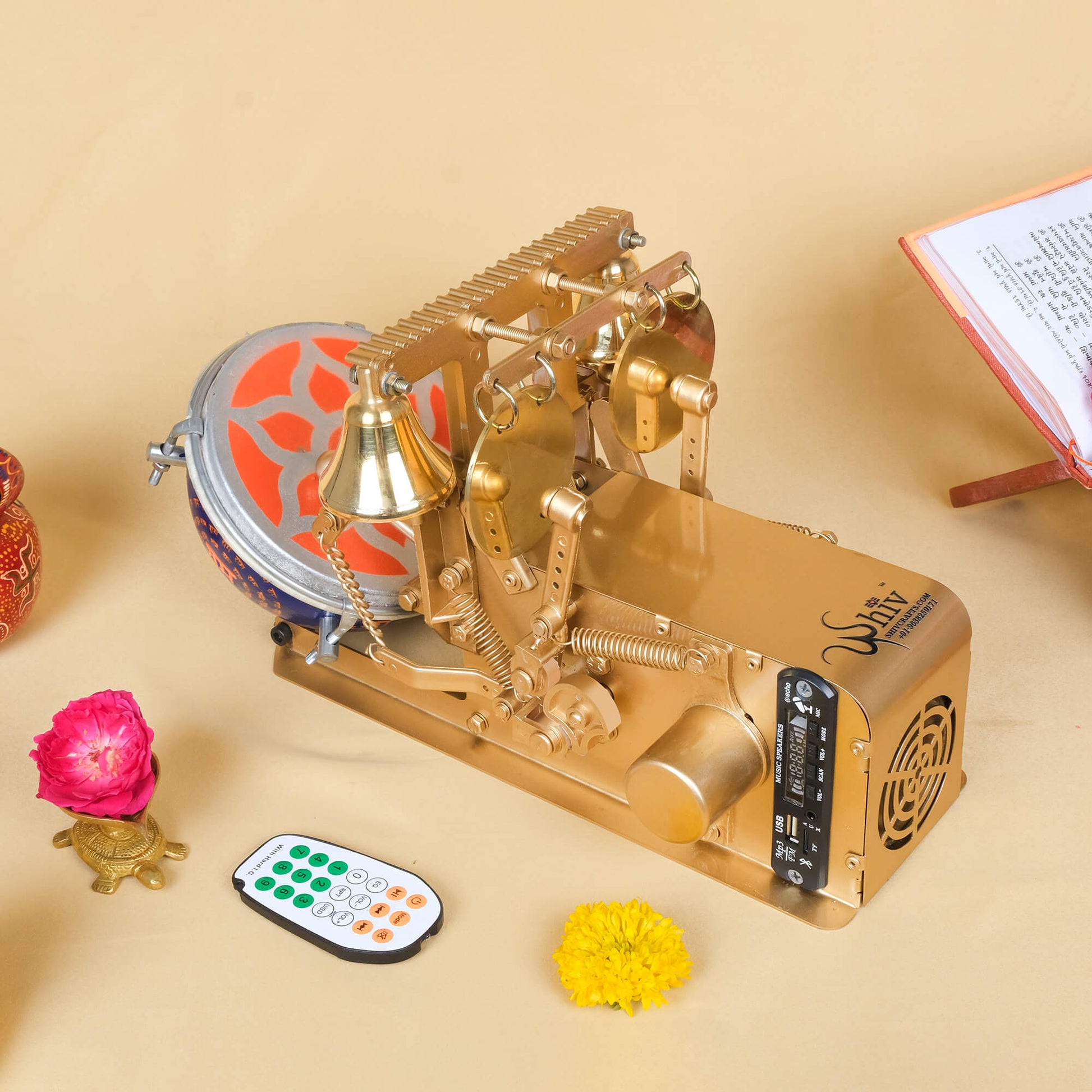 It has a built-in motorized system that automates temple bells, Shankh (conch), and Nagada (drum) sounds. Just plug it in and start the Aarti with a single switch.
